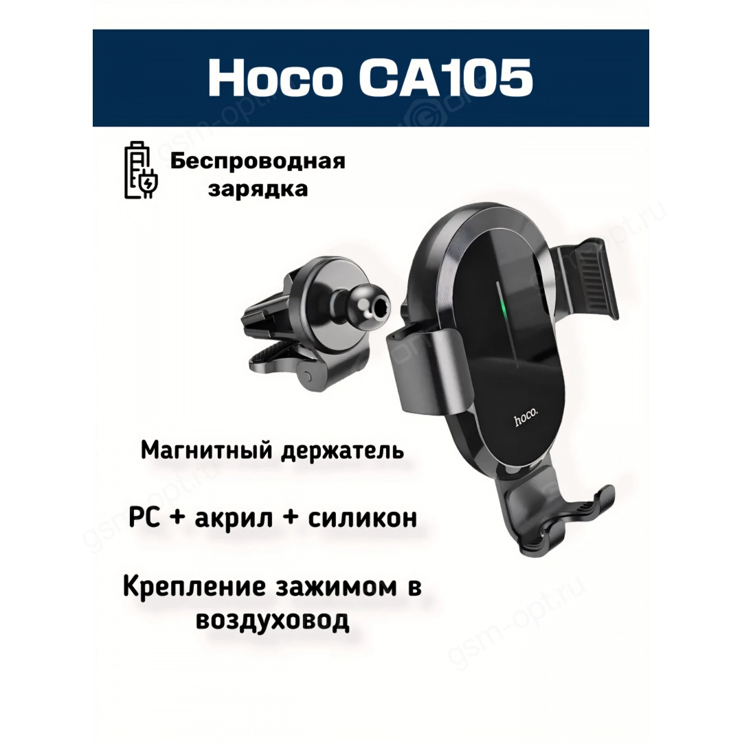Автомобильный держатель Hoco CA105 с беспроводной зарядкой предназначен для зарядки и удержания телефонов, крепится на вентиляционную решётку (воздуховод).