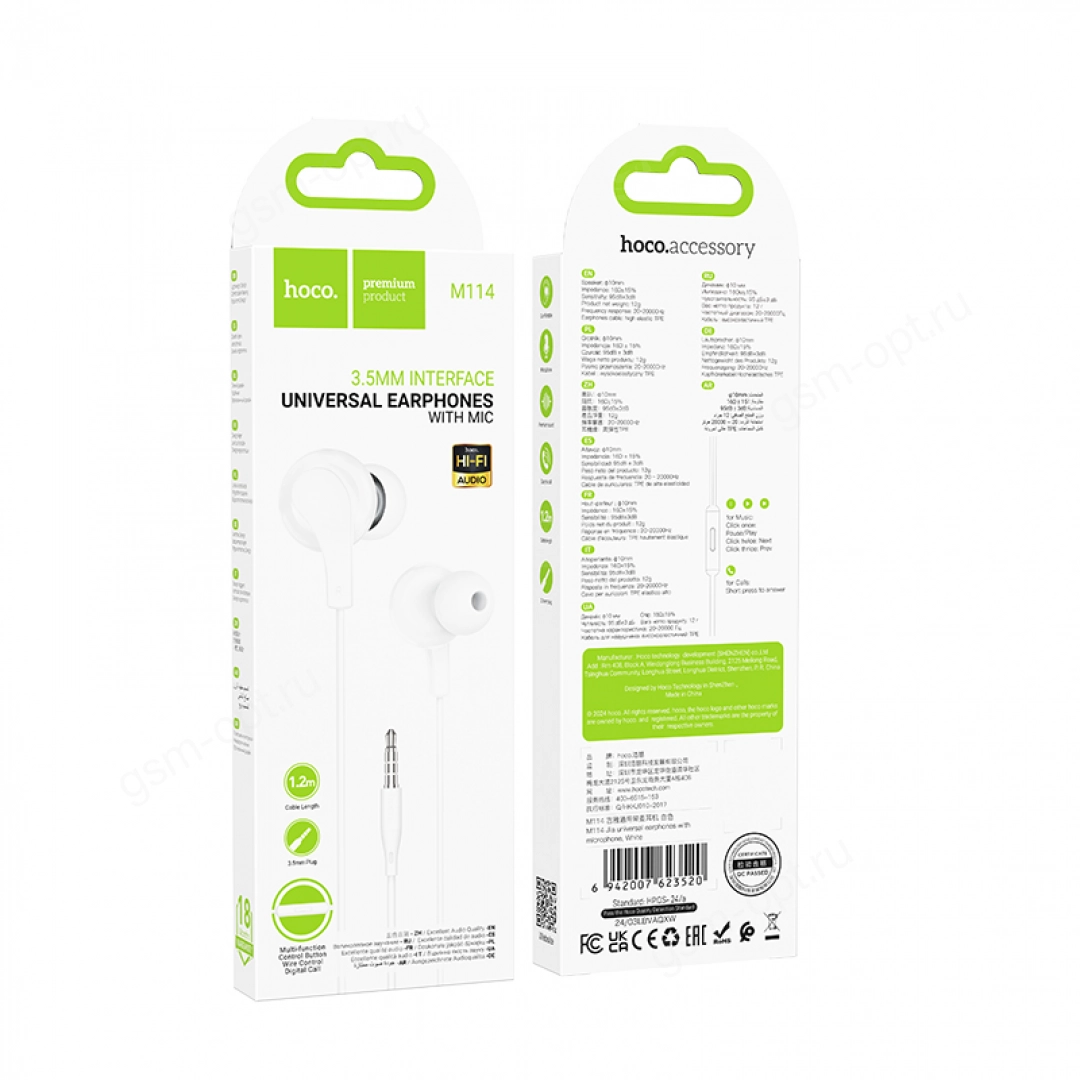 Наушники вакуумные Hoco M114 универсальная стерео-гарнитура с микрофоном, белый