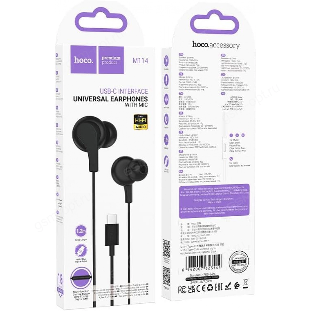 Наушники Hoco M114 Jia, Type-C, черный | Артикул: 6942007623544 | gsm-opt.ru