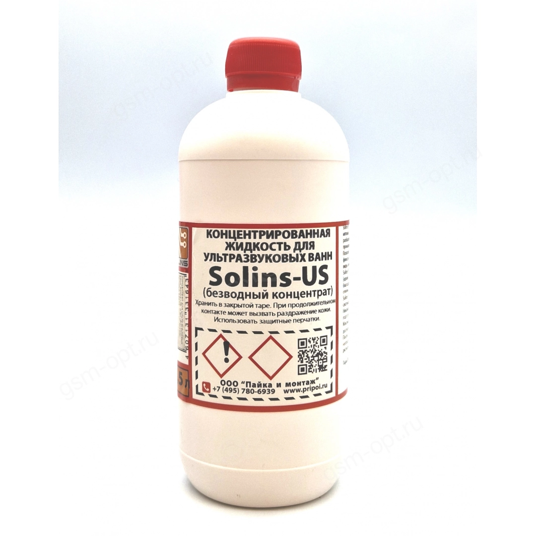 Solins-US представляет собой концентрат с мягкими щелочными свойствами, который разбавляется водой и используется для промывки электронных узлов. Позволяет удалять как остатки канифольных флюсов и органических кислот, так и другие виды неионных загрязнений (масла и жира). Solins-US не содержит неорганических веществ, благодаря чему не разъедает металлы и сплавы. Solins-US используется в стационарных системах отмывки в концентрации около 10%. Никаких специальных мер по подготовке растворов не требуется. Максимальная эффективность отмывки достигается при темпратуре от 40 до 60 С.